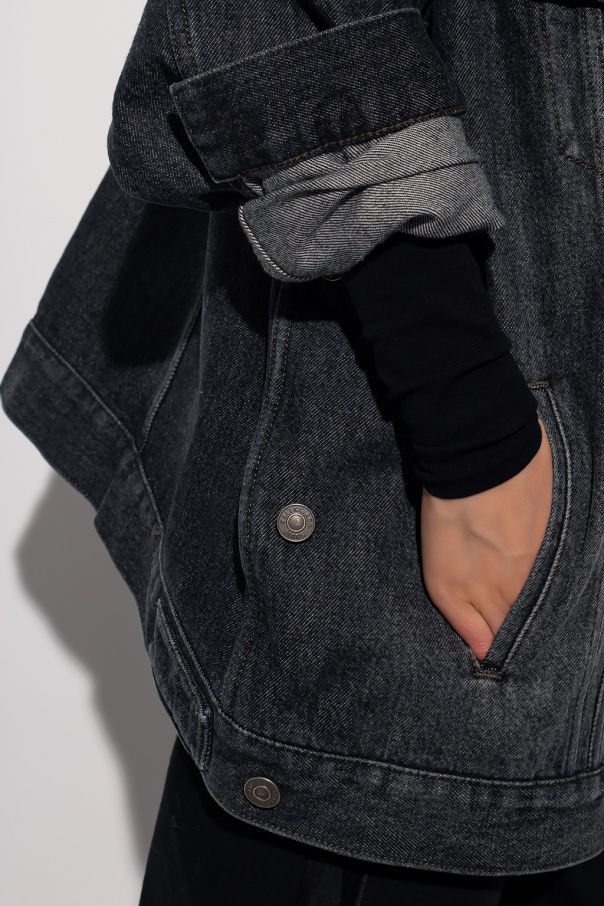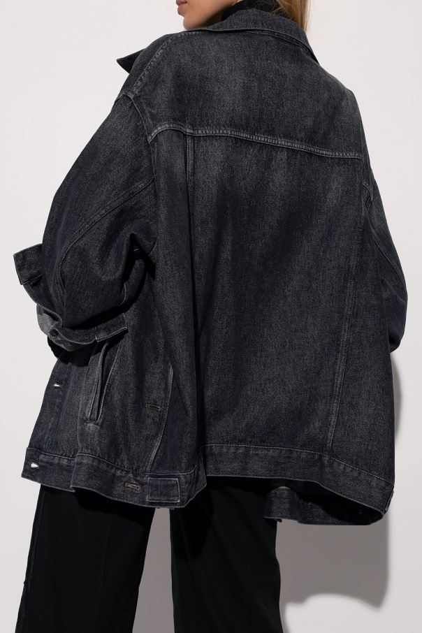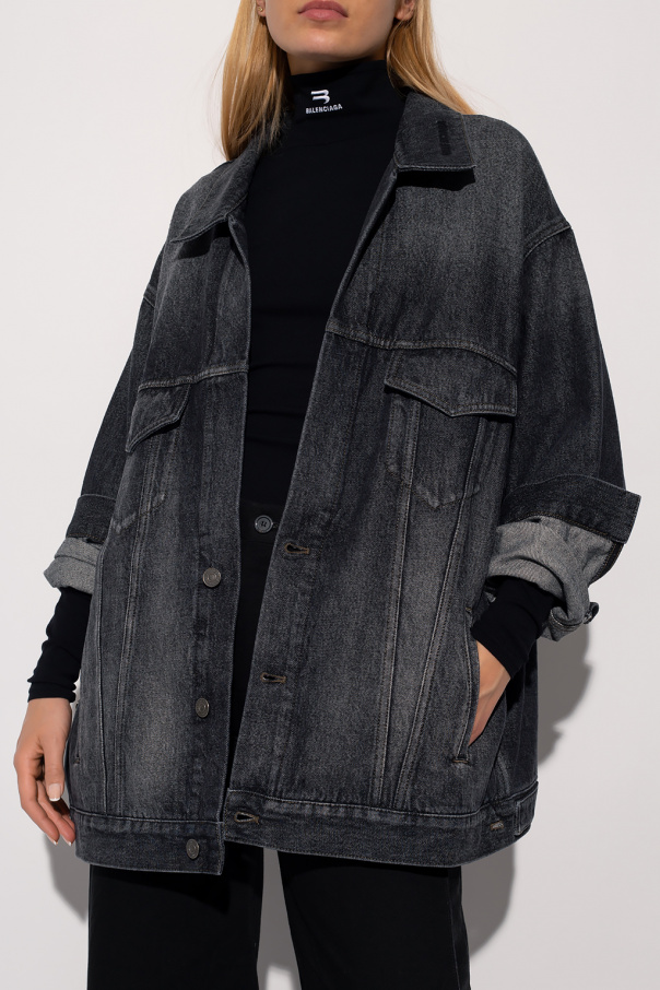 Dark grey denim jacket from Balenciaga. Crafted from cotton, this garment features a decorative asymmetrical closure, embroidered logo pattern in black, two flap pockets, one slip pocket and long sleeves.
