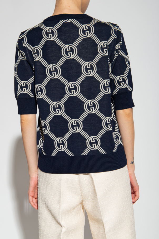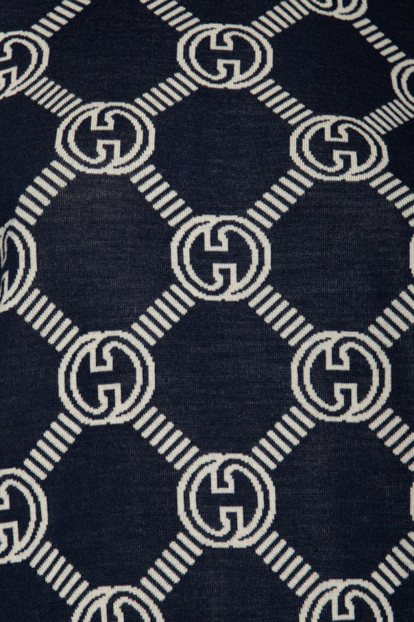 Navy sweater from Gucci. Made of wool, this garment features a cream monogram pattern and ribbed trims at the round neck, hem and cuffs.