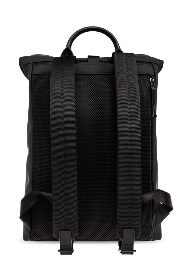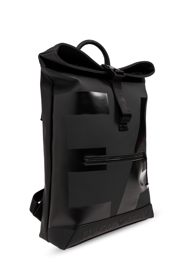 Black backpack from Emporio Armani. Made from fabric, this design fastens via a snap and showcases the brand's logo, one half-round handle, two external zip pockets on the front and back, adjustable shoulder straps and one internal compartment with one zip pocket and two slip pockets.