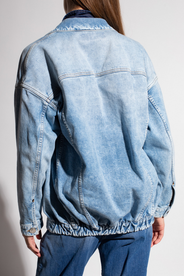 Light blue distressed denim jacket from Dsquared2. Fastened with buttons. Four pockets: two with flaps fastened with buttons and two with slip pockets. Long sleeves finished with cuffs fastened with buttons. The bottom is finished with a elasticated hem and decorated with navy blue and yellow rubber with a logo. Vintage effect.