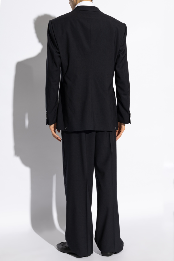 Introducing the Wool Suit by renowned designer Giorgio Armani, an epitome of sophistication and timeless elegance. Crafted from high-quality wool in a dominant navy hue, this suit exemplifies luxury and style. Jacket Construction: This double-breasted jacket boasts wide peak lapels, providing a formal and stylish appearance. It features six glossy, dark buttons arranged in two rows, enhancing its exclusivity. The sleeves are neatly finished with buttoned cuffs, and the jacket includes two flap pockets and a breast pocket, characteristic of classic suits. Close-up images reveal meticulous stitching and button details, showcasing the superior craftsmanship. Trousers: The trousers offer a straight, wide cut, aligning with contemporary men's fashion trends. They are sharply creased for added elegance and feature wide legs for comfort and ease of movement. They are secured with a zipper, clasp, and button for a secure fit. Material: Constructed from premium wool, this suit promises comfort and durability. The exterior is smooth and pattern-free, while the interior lining is a blend of cupro and elastane, ensuring a comfortable fit. Style: This classic, elegant, and formal suit is perfect for official occasions, business meetings, or evening events, making it a versatile addition to any gentleman’s wardrobe. Why Choose This Product? Designed by the iconic Giorgio Armani High-quality wool for comfort and durability Double-breasted jacket with peak lapels for a formal look Meticulously crafted with attention to detail Classic and versatile, suitable for various formal occasions