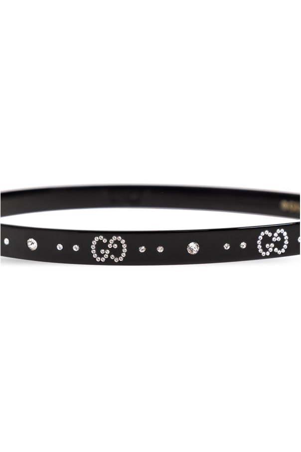 Black headband from Gucci. Made of resin, this item is embellished with crystals and the brand's logo.