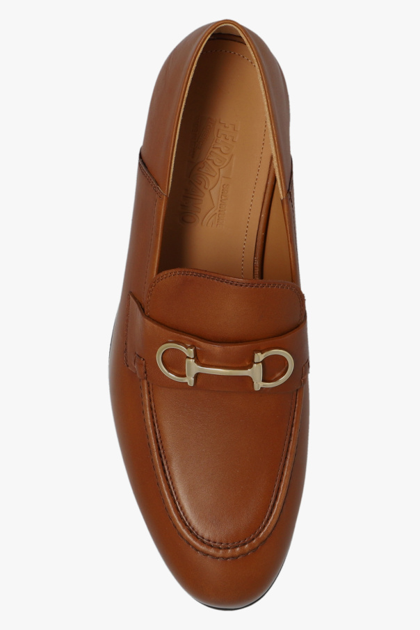 Brown ‘Ottone’ shoes from FERRAGAMO. Made of leather, this pair features the brand’s signature detail in gold-tone and beige leather sole.