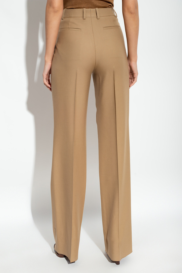 Beige trousers from Saint Laurent. Crafted from wool with a high-rise waist, this pair falls with wide legs and features a zip fly with a button and hook, pleats and four slip pockets.