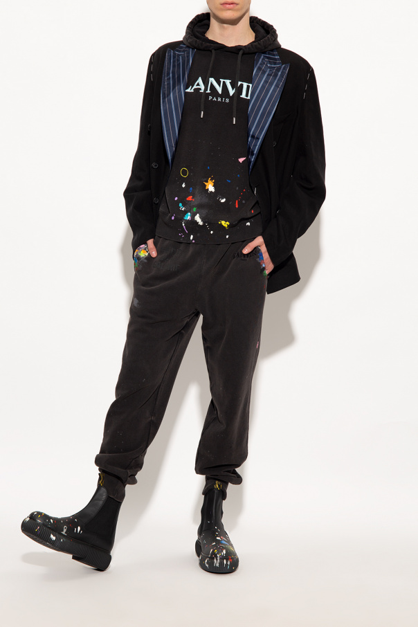 Black ‘Arpege’ chelsea boots from Lanvin x Gallery Dept. Made of leather, this pair is enriched by a multicolored paint splatter effect by Josué Thomas and rests on a textured chunky sole made of rubber.