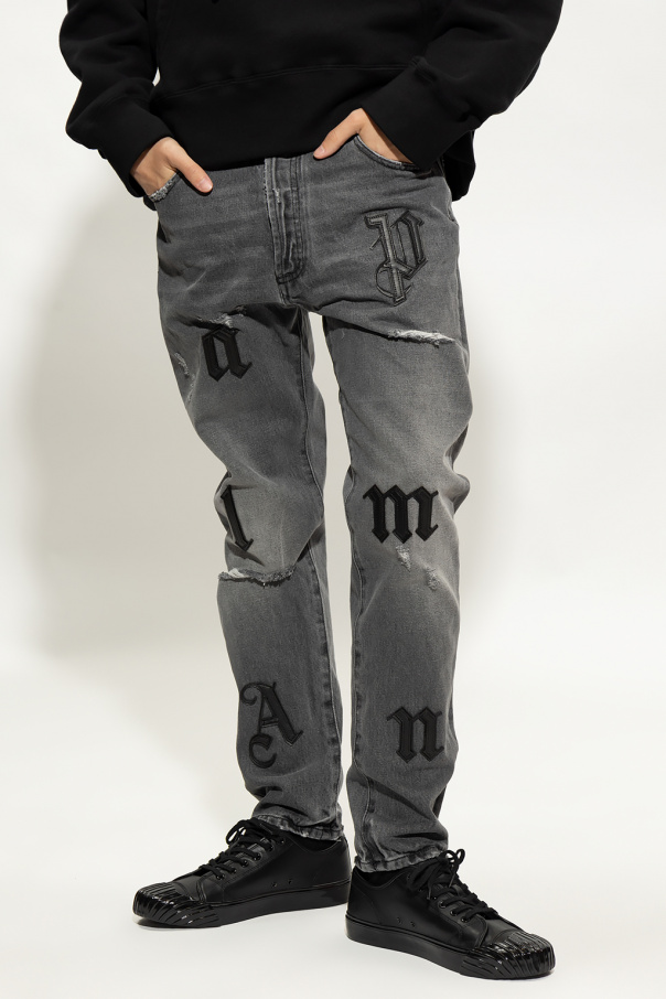 Grey distressed jeans from Palm Angels. Fastened with buttons, this pair features black logo patches, three front pockets, two back pockets and slightly tapered legs.