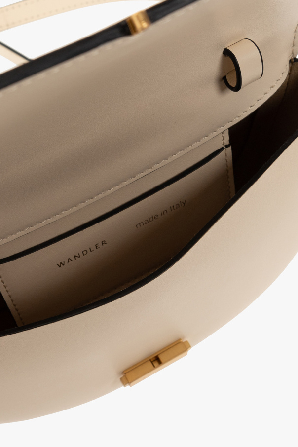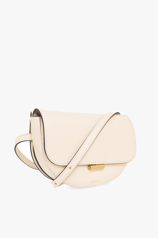 Cream ‘Anna’ belt bag from Wandler. Crafted from nubuck, this design fastens with a snap and showcases an embossed logo on the front, a back zip pocket, an adjustable strap, gold-tone metal hardware and one internal compartment with a card slot. Can be worn as a shoulder bag.