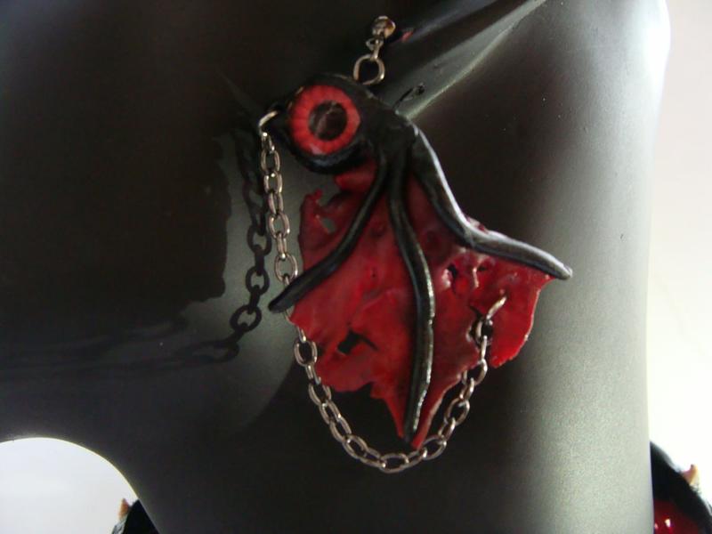 В центре чокера стоящий рот с глазом внутри и языком, ложющимся в яремную ямку, шею окутывают крылья