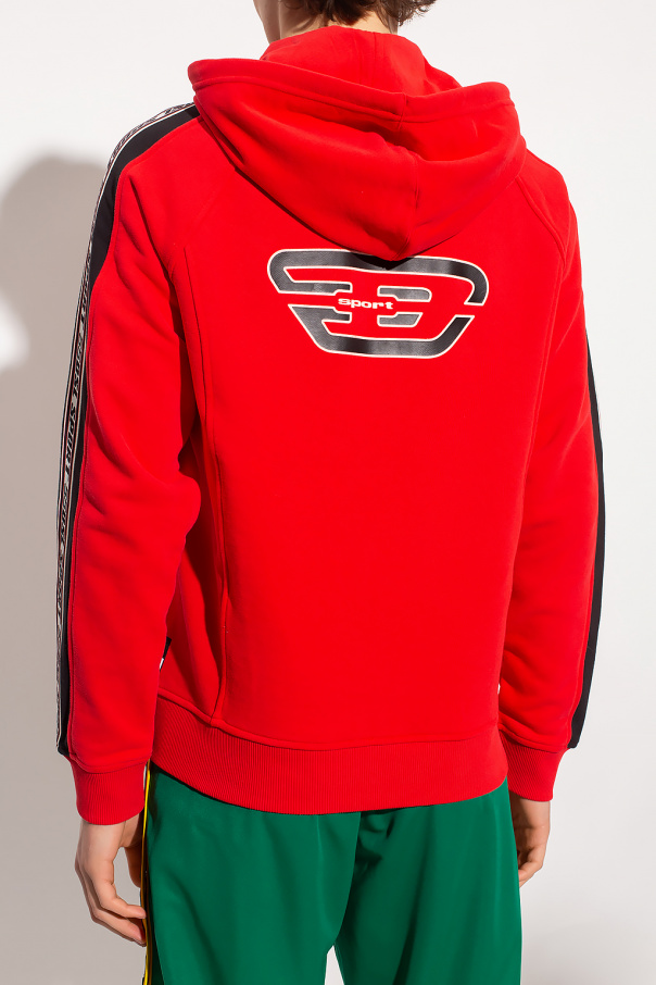Red and black 'AMST-TRASTEER-HT01' hoodie from Diesel, the ‘Diesel Sport’ collection. Made of moisture-wicking fabric that stays dry, this design is complete with a zip fastening, drawstring hood, logo detail, two front pockets and ribbed trims at the hem and cuffs.