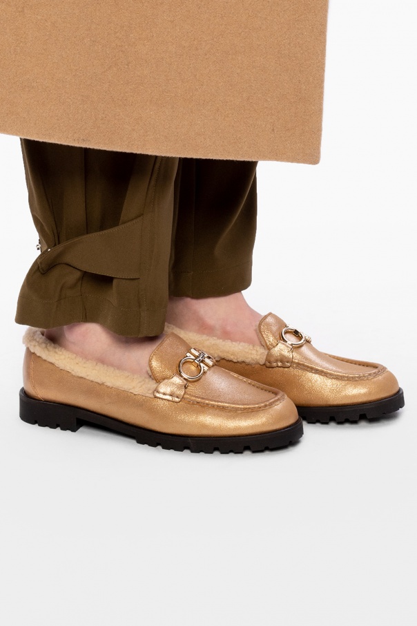 Gold-tone ‘Rolo’ loafers from Salvatore Ferragamo. Trimmed with fur, this design features a logo-embossed horsebit in gold-tone and a black rubber sole.