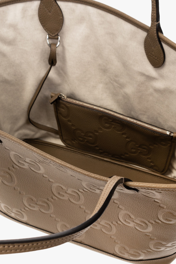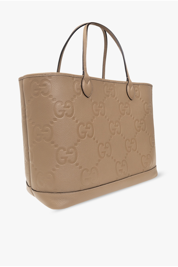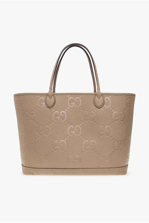 Brown shopper bag from Gucci. Crafted from leather with an embossed monogram, this design features two half-round handles and one internal compartment with a removable zip pouch.