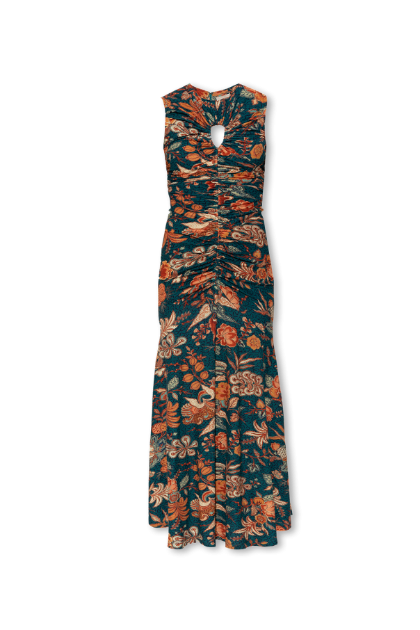 Bluish green ‘Gwynne’ patterned dress from Ulla Johnson. Made of cotton, this fitted design features a hidden zip and hook at the back, orange and cream floral pattern, decorative gathers at the top, flared skirt and round neck with a teardrop cut-out.