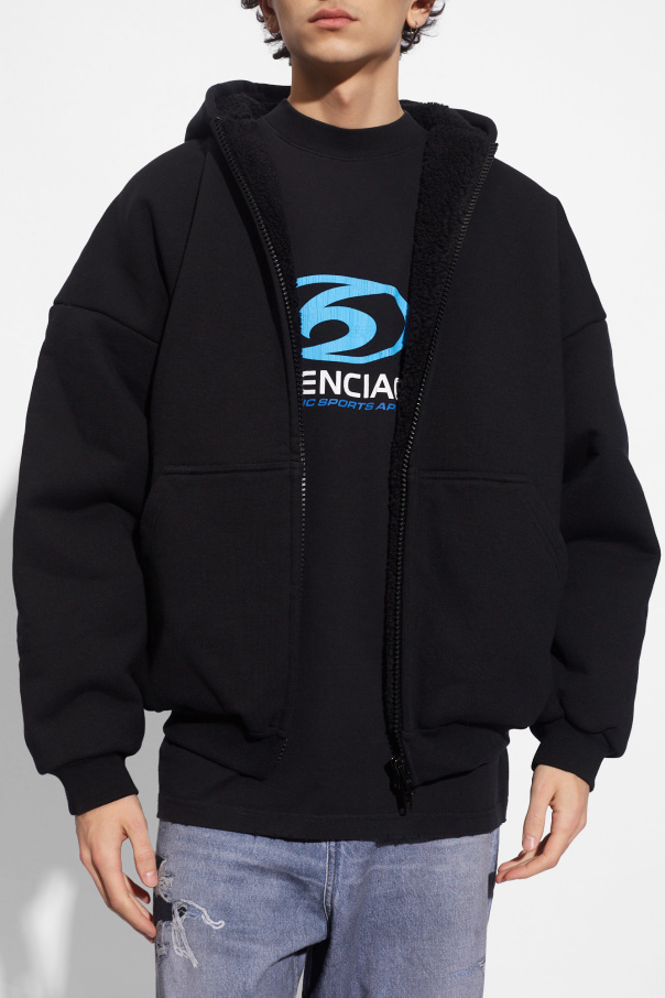 Black hoodie from Balenciaga, the ‘Skiwear’ collection. Made of cotton, this design features a two-way zip, reflective logo print on the hood, two slip pockets, fleece lining and ribbed trims at the hem and cuffs.