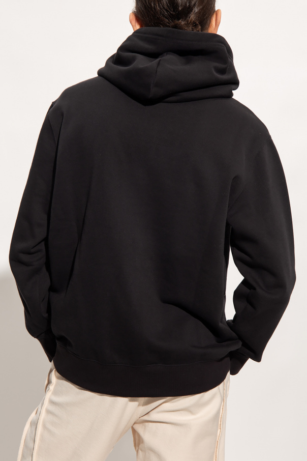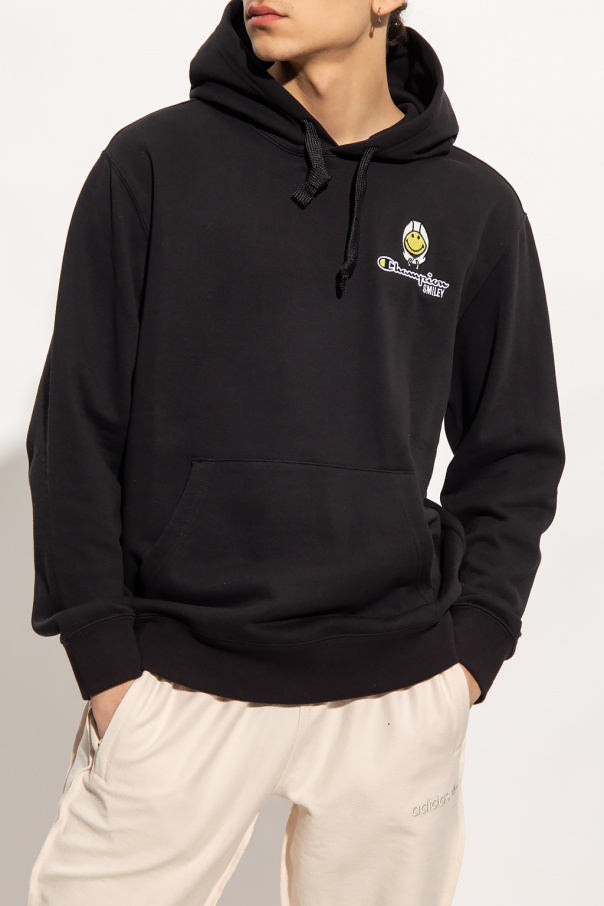 Black hoodie from Champion x Smiley®. Crafted from cotton, this long sleeve design features a drawstring hood, grey, yellow and white embroidered logo pattern, slip pocket and ribbed trims at the hem and cuffs.