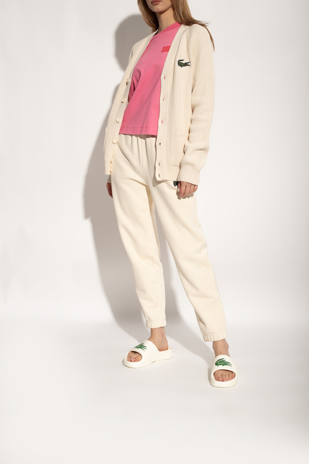 White slides with a logo pattern and white rubber sole from Lacoste.