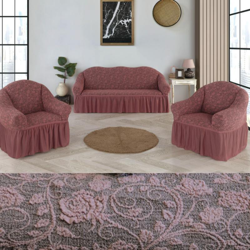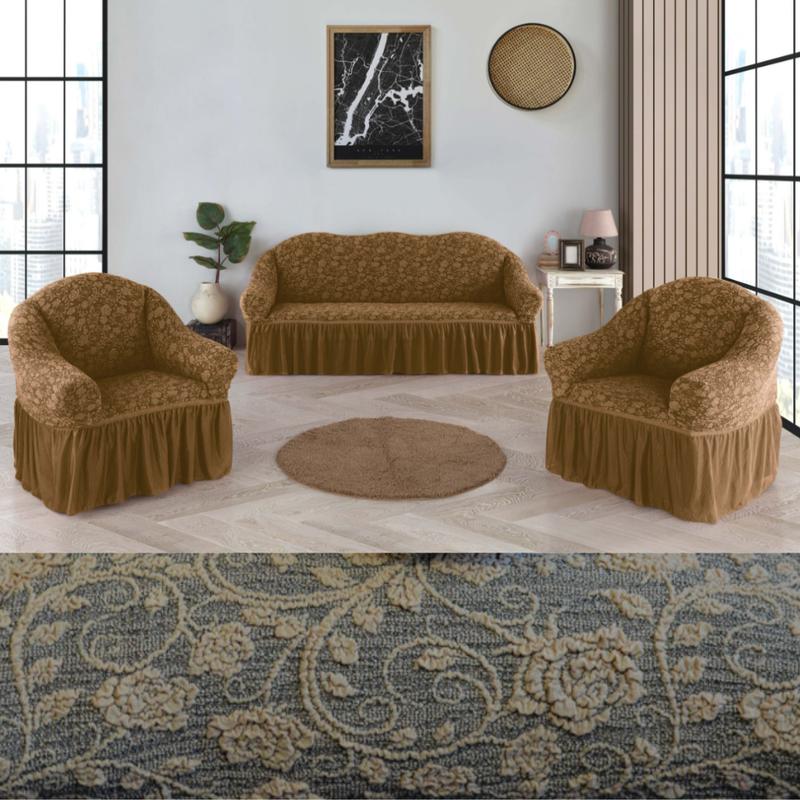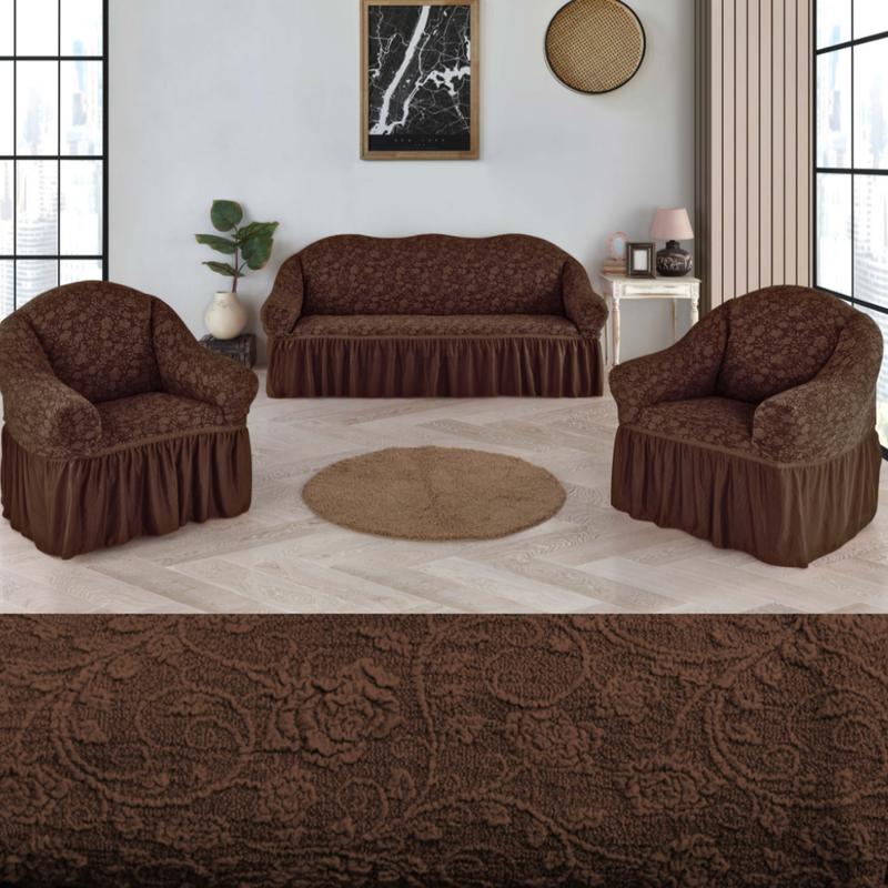 Это идеальное решение за минимальные деньги.Цвета чехлов на диван и кресла с юбкой: бежевый, коричневый кремовый, серый,