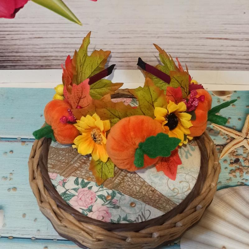 Обруч для волос осенний с тыквами,на праздник осени,для фотосессии,в основе металлический ободок.
