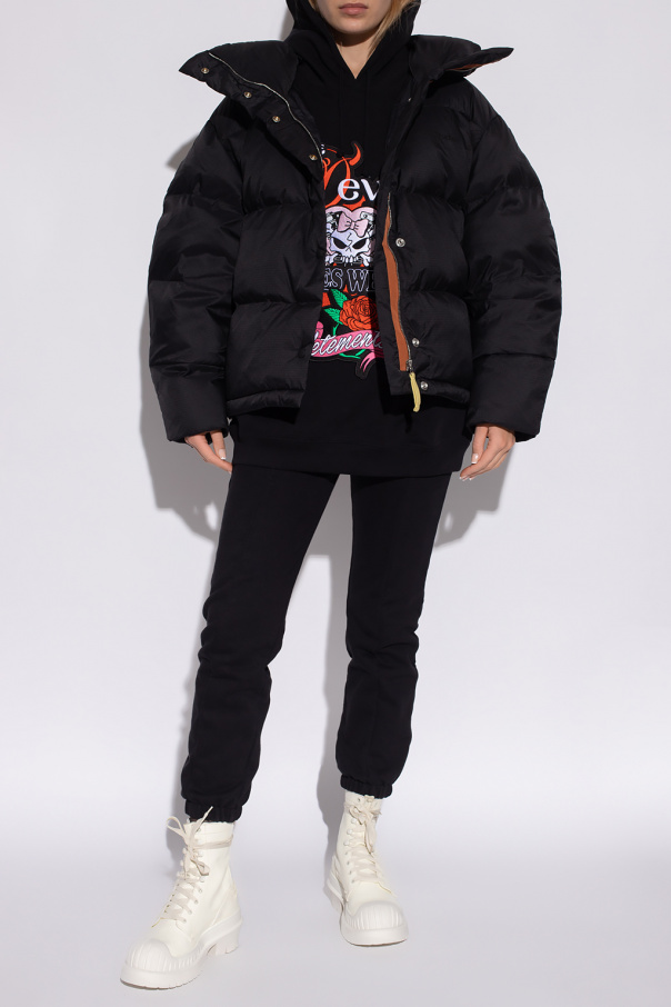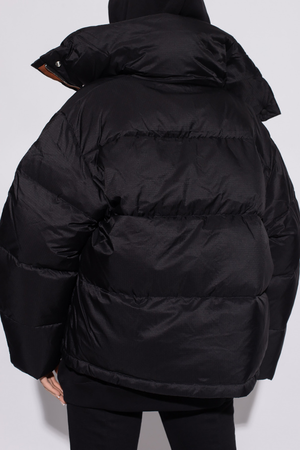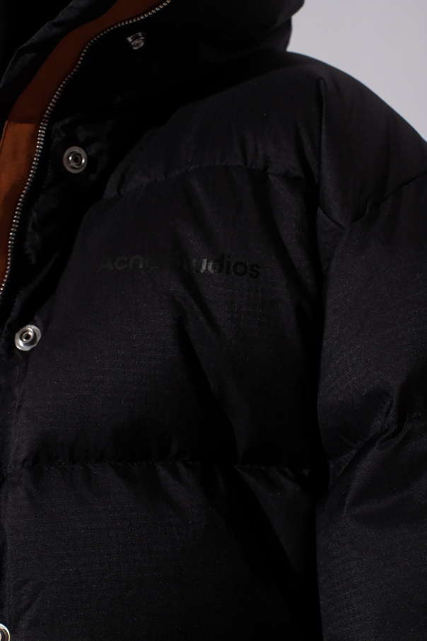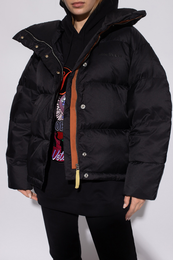 Black jacket with a high neck from Acne Studios. Fastened with a zip and snaps, this garment features a black logo pattern, two slip pockets, drawstring hem and long sleeves with ribbed trims.