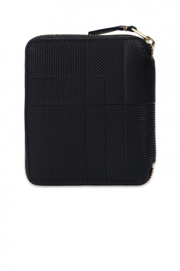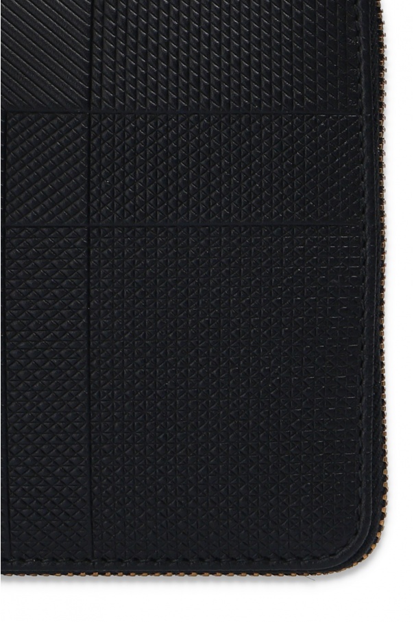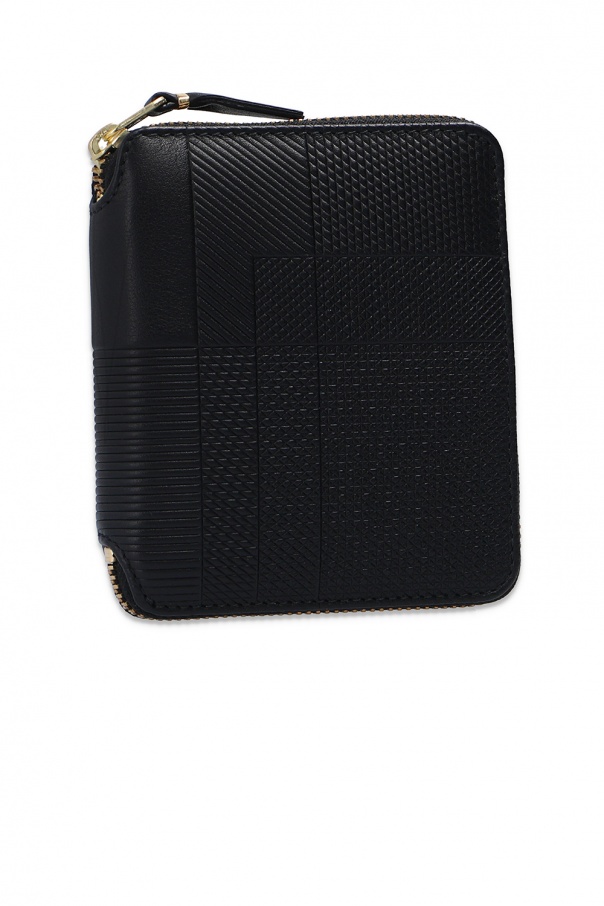 Black wallet from Comme des Garçons. Crafted from textured leather, this item features a zip fastening as well as a gold-tone logo print, four slip pockets, one snap pocket and one bill compartment on the inside.