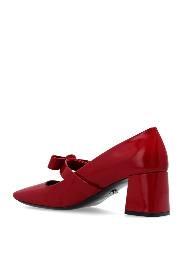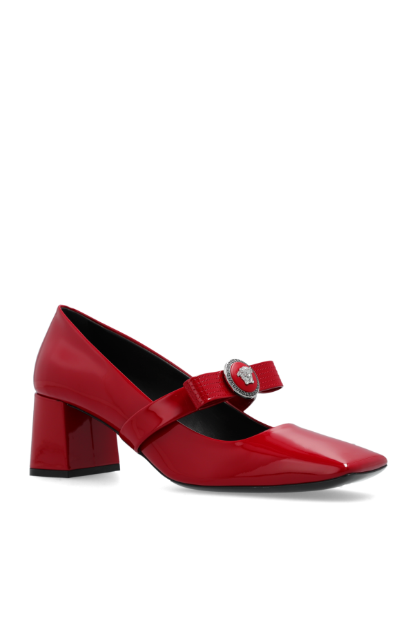 Introducing the exquisite Gianni Heeled Shoes from the renowned house of Versace. These shoes are the epitome of elegance and luxury, designed for the discerning fashion connoisseur. Featuring a classic Mary Jane design with a rounded toe, these shoes are crafted from lustrous red patent leather, exuding opulence and sophistication. The high, stable block heel ensures both style and comfort, making them an ideal choice for any occasion. The front strap is secured with a metal buckle adorned with the iconic Medusa head, a hallmark of Versace's timeless elegance. The interior is lined with black leather, creating a striking contrast with the vibrant red exterior. A visible Versace logo graces the inner side, adding a touch of exclusivity. Perfect for those seeking a bold yet refined accessory, these shoes will elevate any ensemble with their distinctive flair. Why Choose This Product? Exclusive Design: Classic Mary Jane style with a luxurious twist. Premium Materials: Crafted from high-quality patent leather. Iconic Details: Features the signature Medusa head buckle and Versace logo. Comfort and Style: High block heel for stability and elegance. Versace Legacy: A symbol of unparalleled craftsmanship and innovative Italian design.