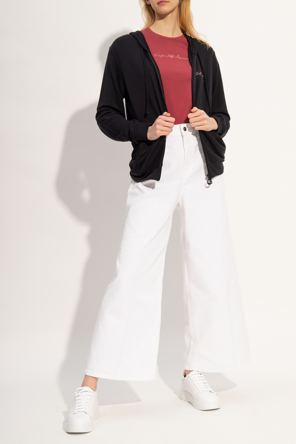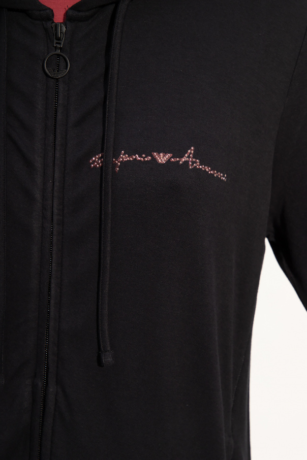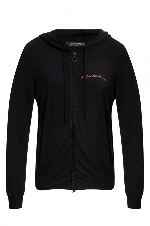 Black sweatshirt with a drawcord-adjustable hood from Emporio Armani. Crafted from cotton jersey, this hoodie showcases a pink and white logo appliqué, a kangaroo pocket and a ribbed bottom hem and cuffs.