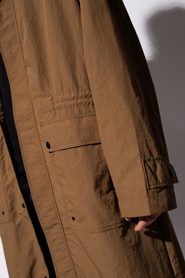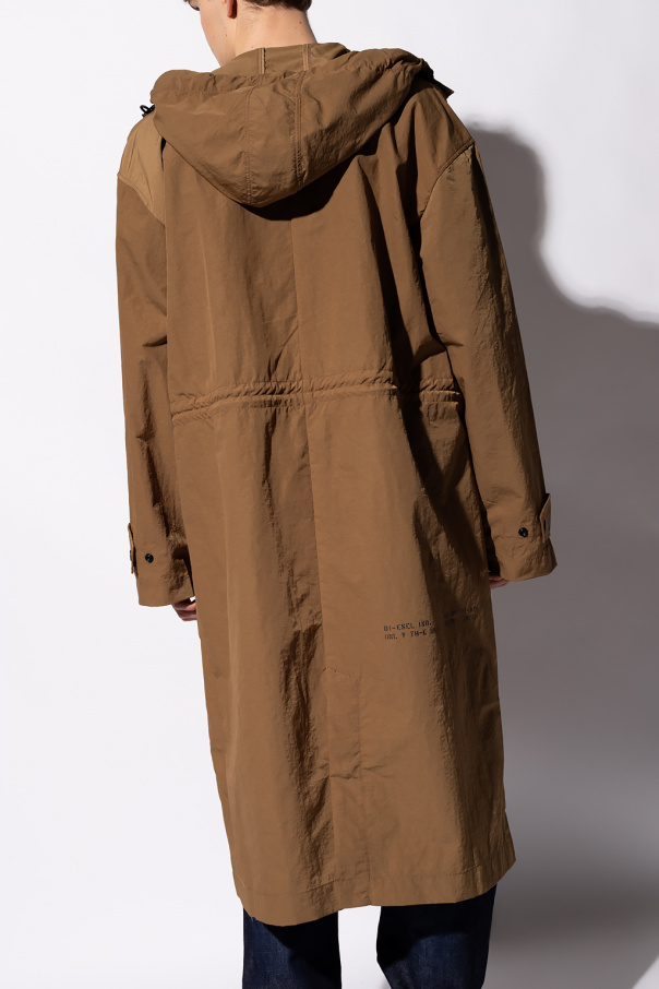 Brown rain coat from Diesel. Fastened with snaps, this design features a drawstring hood, two slip pockets, two snap-fastened flap pockets, long sleeves, a black logo printed at the back and a single rear vent.