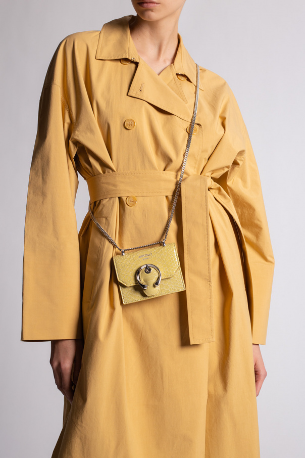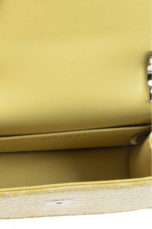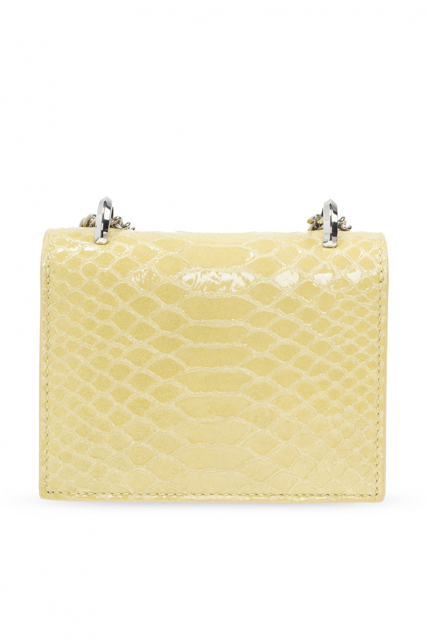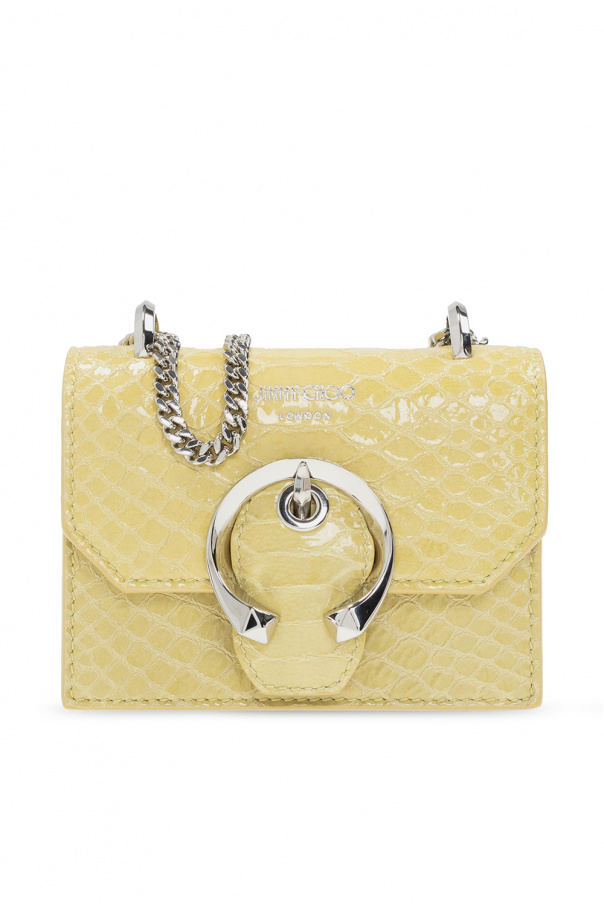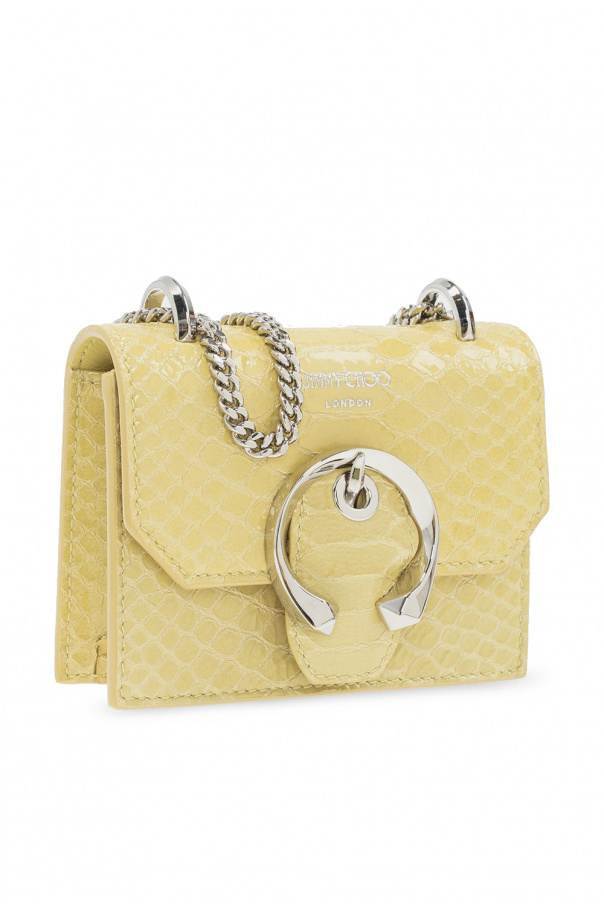 Yellow ‘Mini Paris’ shoulder bag from Jimmy Choo. Made of leather, this design features a magnetic closure, embossed logo, chain strap, silver-tone metal hardware and one internal compartment with one slip pocket.