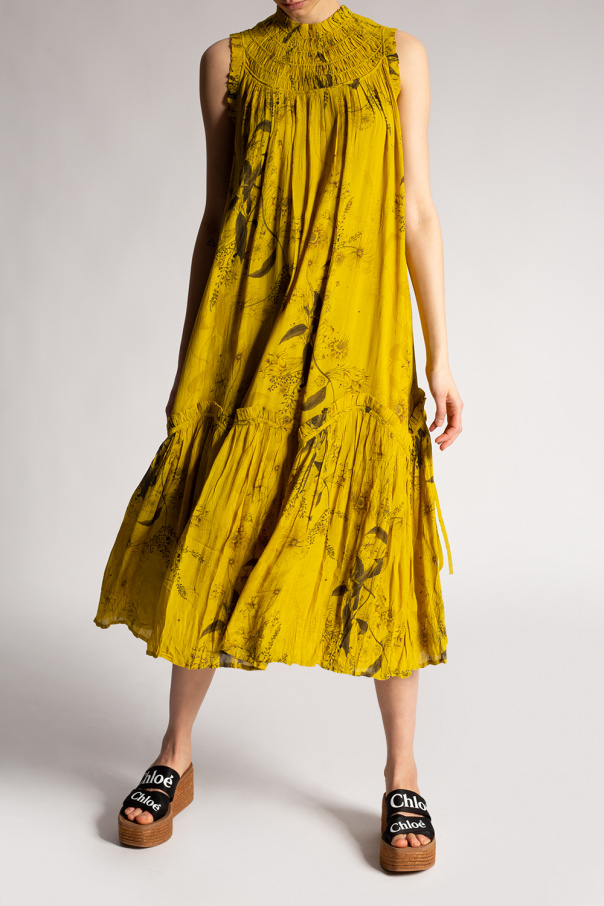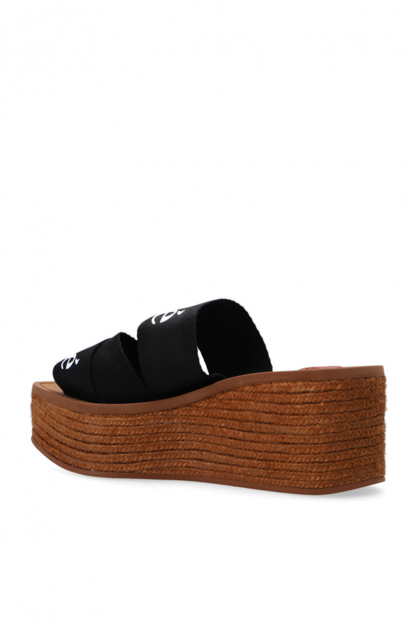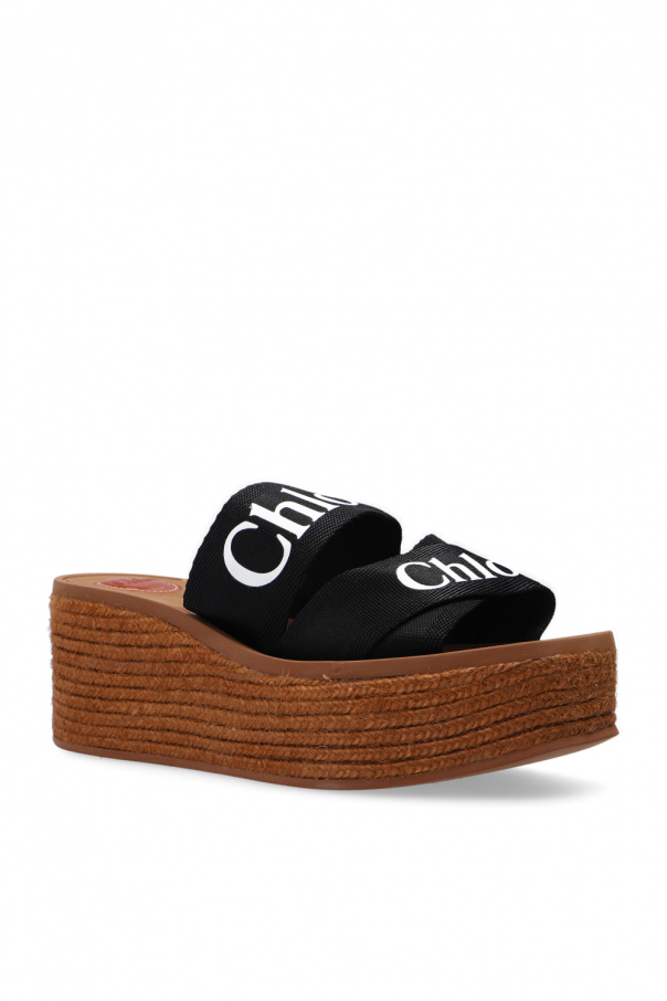 Black and brown wedge slides from Chloé. Printed with the brand's logo in white, this pair sits on a brown rubber sole.