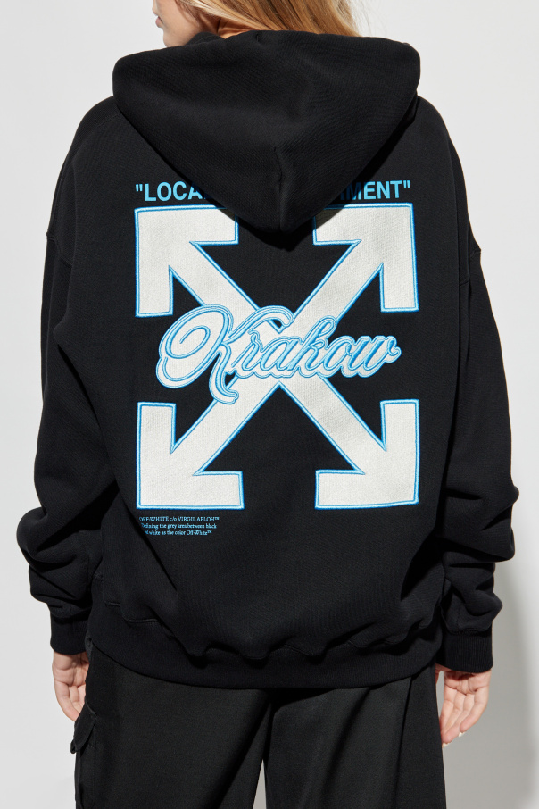 Introducing Exclusive for DH Vitkac – a black hoodie from the exclusive collection by the renowned brand Off-White. Made from the highest quality cotton, it offers a relaxed fit that ensures comfort and ease of wear. The hoodie features a classic design with a kangaroo pocket and a subtle logo in the form of a cross with four arrows, placed on the front. Next to the logo, there is the word “Kraków” in a stylized font with a blue outline, adding a unique character to it. On the back of the hoodie, there is a large graphic depicting a cross with arrows and the centrally placed word “Kraków,” above which is the phrase “LOCAL GARMENT.” The black color scheme with light blue and white accents creates a modern and stylish look. Why should you buy this product? High-quality material: 100% cotton. Universal unisex fit. Exclusive design by Off-White. Unique details inspired by local culture.