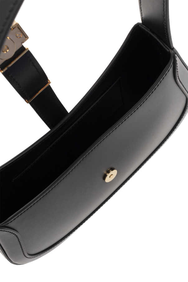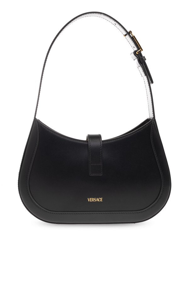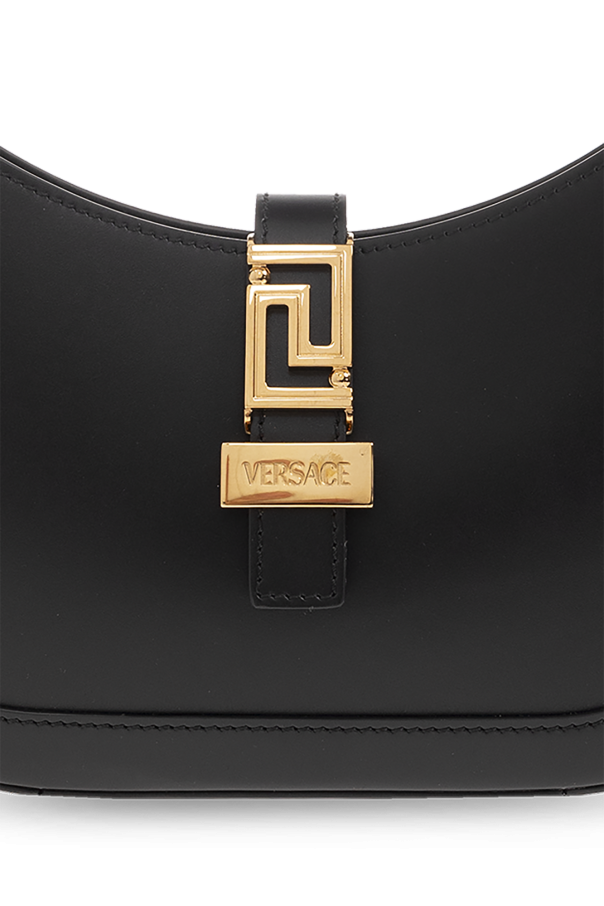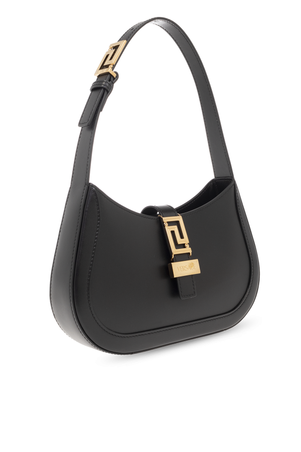 Black ‘Greca Goddess Small’ shoulder bag from Versace. Made of calf leather, this design features a magnetic snap closure, metal Greca details with an engraved logo, adjustable shoulder strap, gold-tone metal hardware and one internal compartment with one slip pocket.
