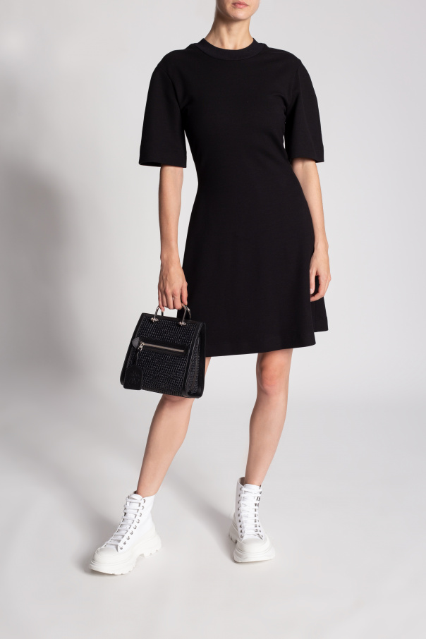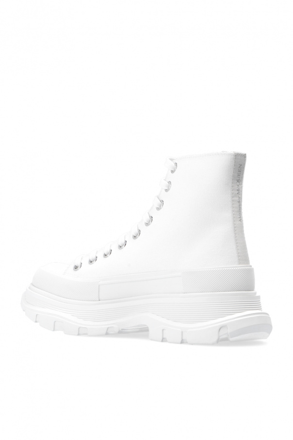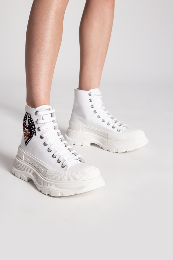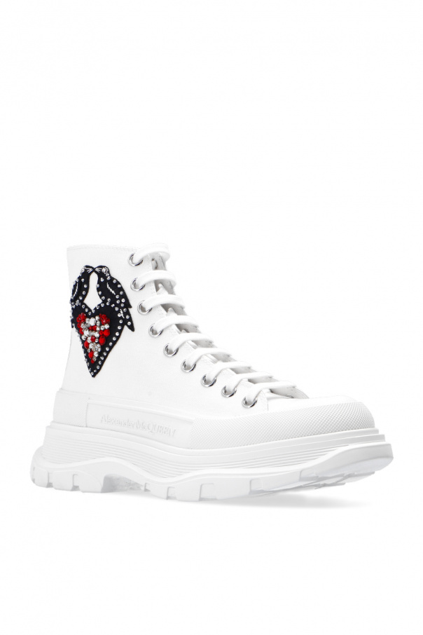 White high-top sneakers from Alexander McQueen. Set on a white rubber sole with a raised logo, this lace-up pair features a decorative appliqué to the side.