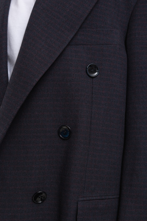 Navy blue ‘Klero’ blazer from Isabel Marant. Embellished with a fine check pattern in red, this style features a double-breasted, oversize silhouette, peak lapels, one slip pocket, two flapped pockets, dropped shoulders and long sleeves with button cuffs.