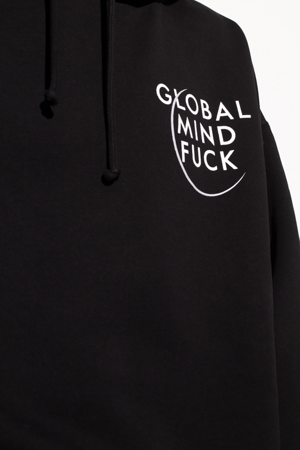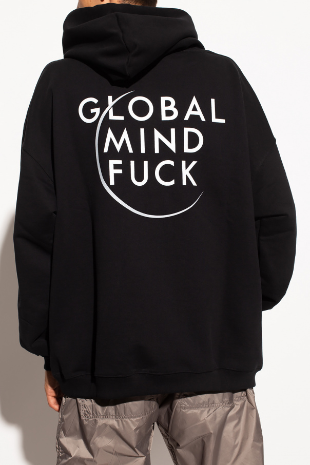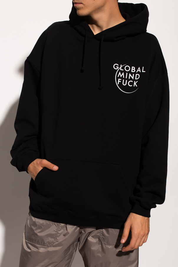 Black sweatshirt with a drawcord-adjustable hood from VETEMENTS. Crafted from cotton jersey, this hoodie showcases a white graphic print, a kangaroo pocket and ribbed trims on the bottom hem and cuffs.