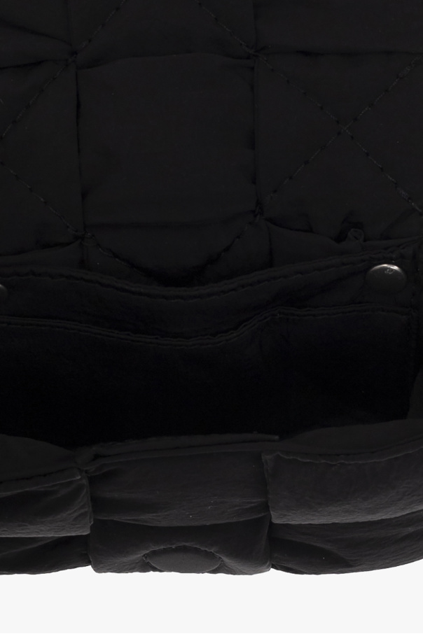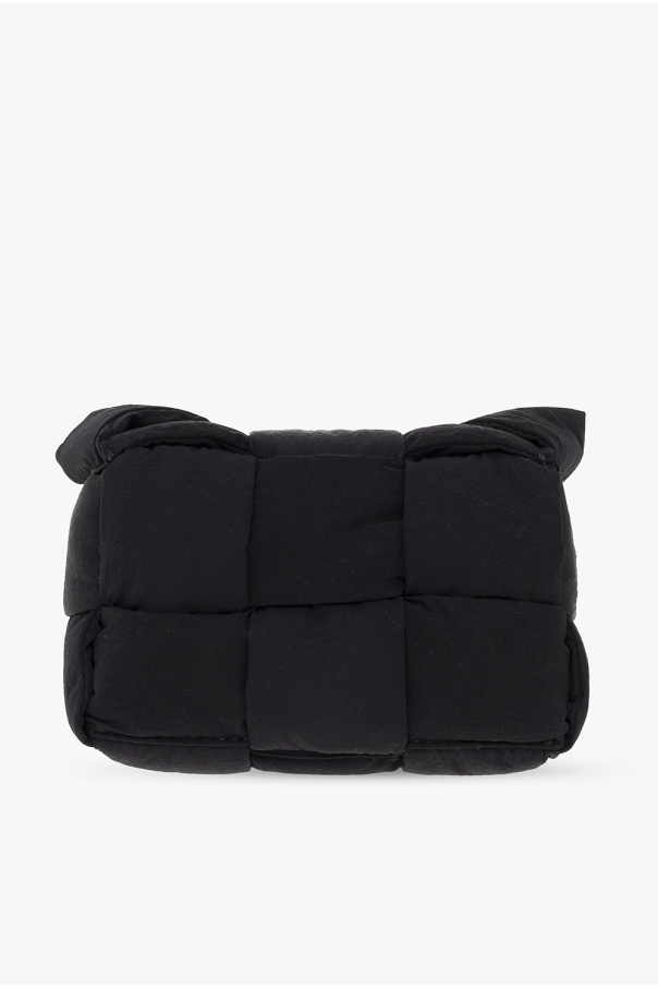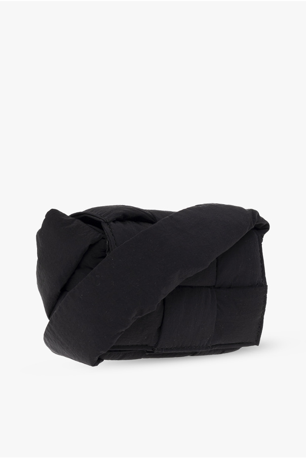 Black ‘Cassette Mini’ shoulder bag from Bottega Veneta. Crafted from technical material accentuated with the brand's signature ‘Intreccio’ weave, this design fastens with a magnetic snap and features an adjustable shoulder strap and one internal compartment with a card slot.