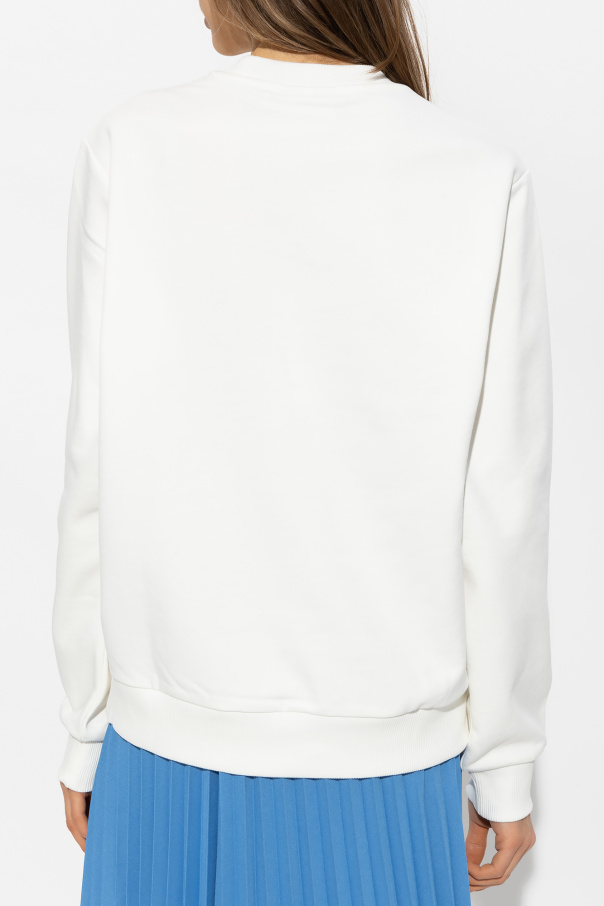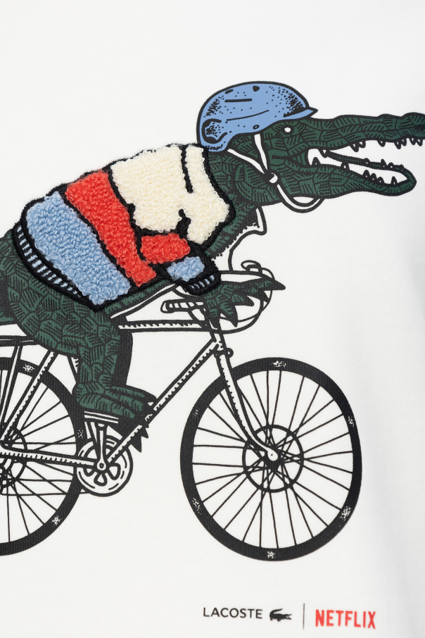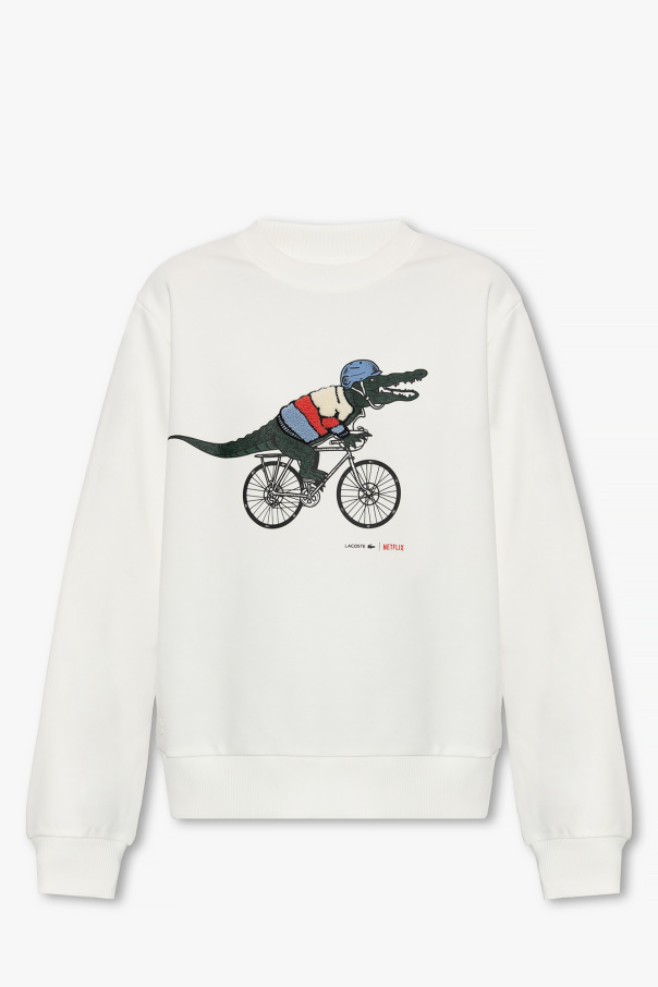 White crewneck sweatshirt from Lacoste x Netflix. Made of organic cotton, this long sleeve design is decorated with a logo motif inspired by the show Sex Education and has ribbed trims at the neck, hem and cuffs.