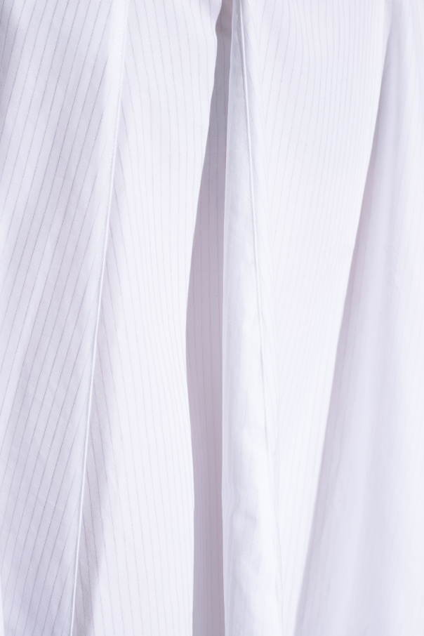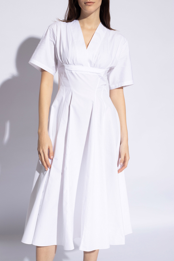 White dress from Alaia. Made from cotton, this style fastens via a hidden back zip and hook & eye closure and features a form-fitting bodice with a V-neckline, short sleeves, draped front and a flared hem with two slip pockets.