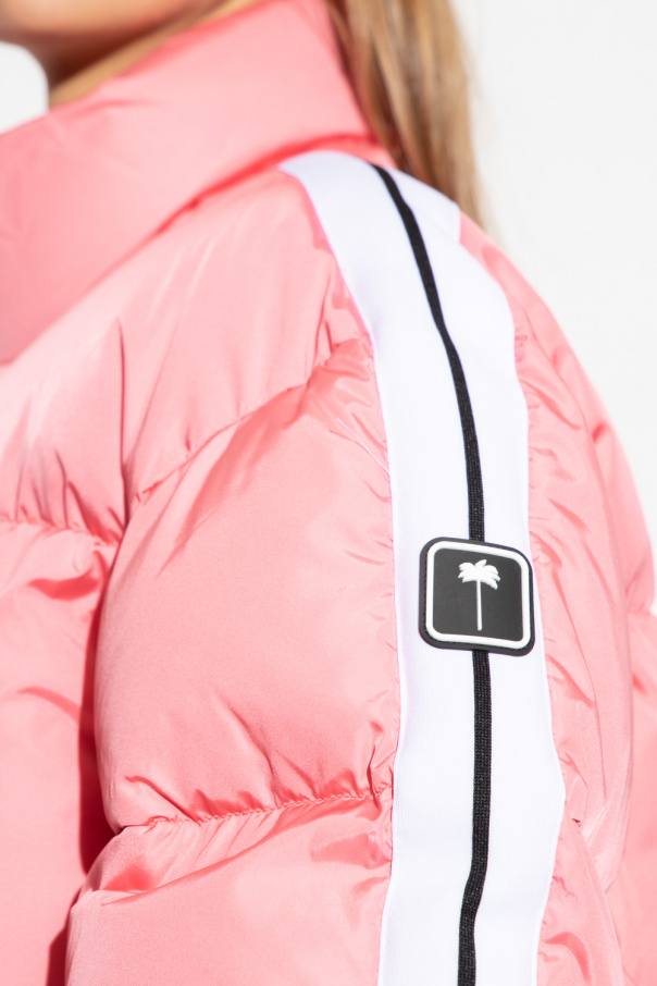 Pink down jacket with a stand collar from Palm Angels. Fastened with a zip, this garment features a white logo print, sleeves with black and white stripe and rubber patch with the brand’s signature palm tree motif, two zip pockets, drawstring hem and long sleeves with ribbed cuffs.