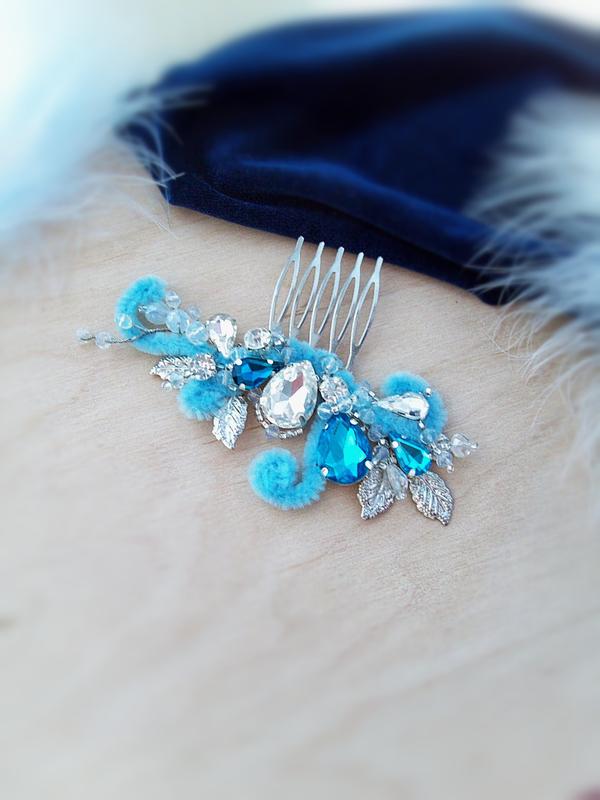 "Зимние узоры"- новый авторский гребень в холодных тонах изумительно сочетается с бархатным платьем или с нарядом, в котором есть меховый декор. Зимним невестам особенно рекомендуется . Нежный, изысканный, необычный. Сочетание хрустальных бусин, страз, фурнитуры цвета серебра и бархатных нежно-голубых элементов - создаёт неповторимую композицию напоминающую морозные узоры на стекле.