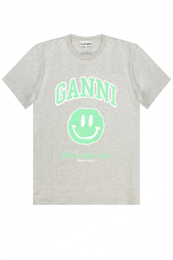 Grey crewneck T-shirt from Ganni. Crafted from cotton, this design has a green and white logo printed across the front.