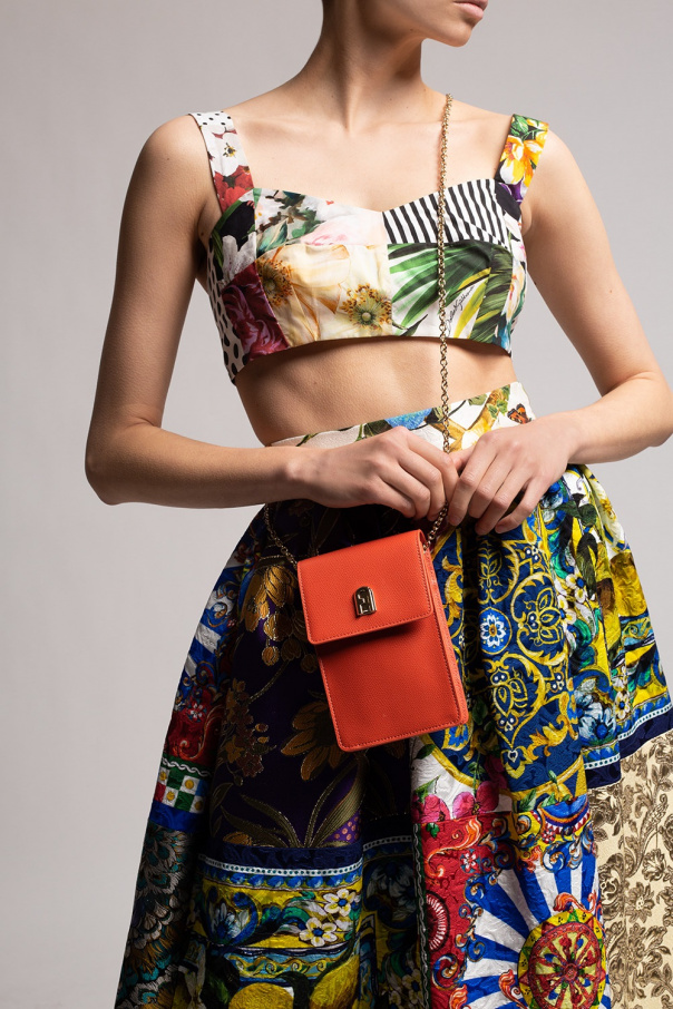 Orange ‘1927’ phone holder from Furla. Crafted from textured leather, this design features a magnetic closure, logo appliqué, back slip pocket, shoulder chain, gold-tone metal hardware and one internal compartment with one slip pocket.