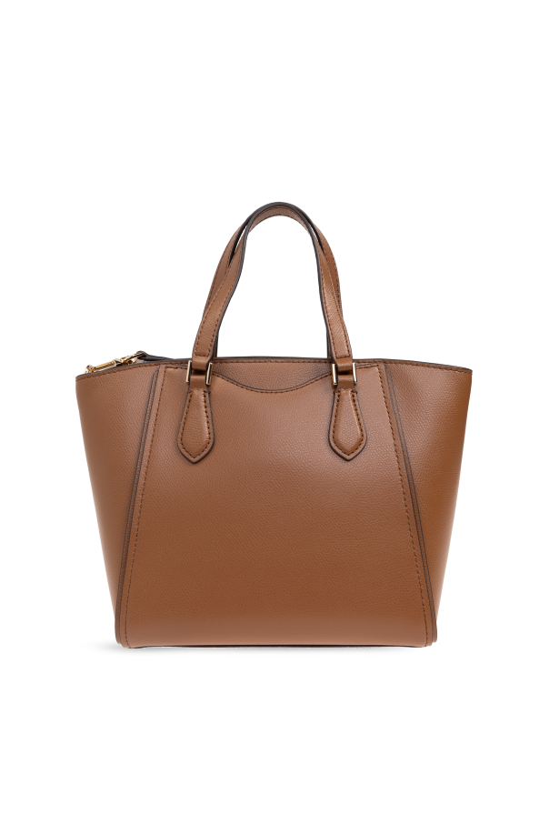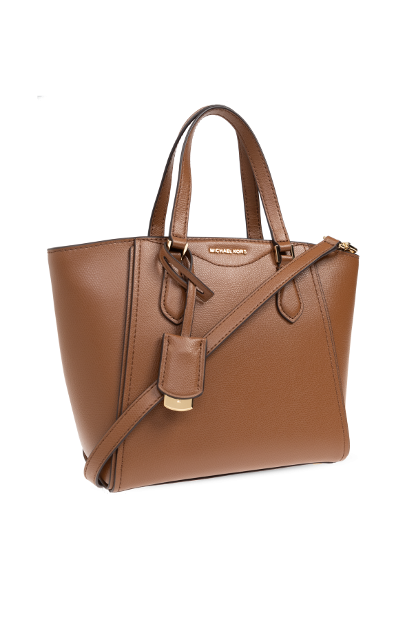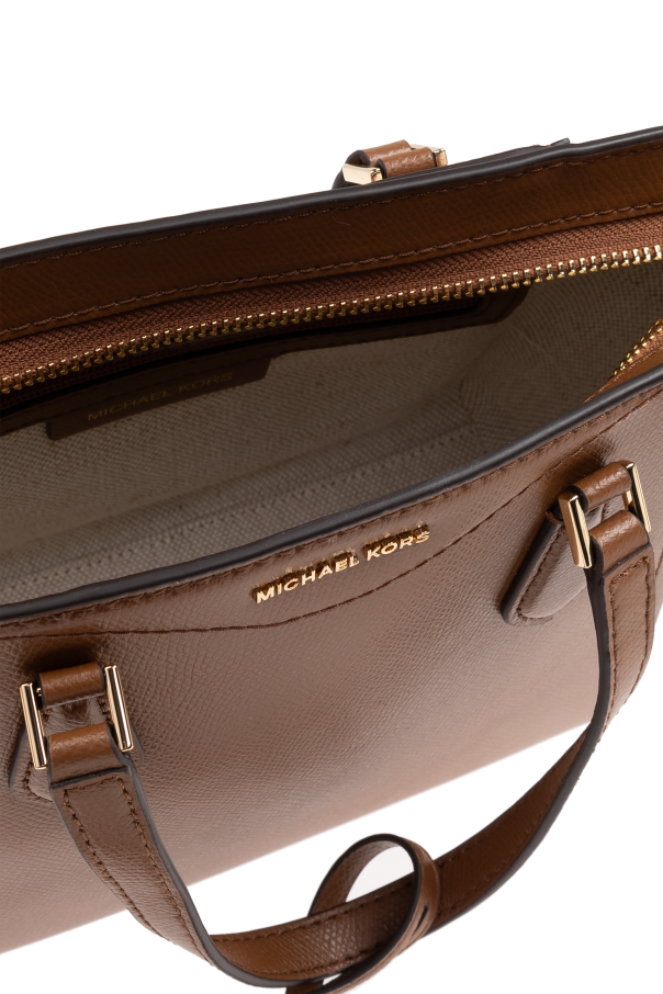 Indulge in the epitome of sophistication with the Michael Kors Taryn Shoulder Bag from our exclusive collection. Crafted with unparalleled finesse, this trapezoidal masterpiece exudes an air of timeless elegance. The smooth, pattern-free design amplifies its classic allure, while the rich brown hue ensures versatile pairings with various ensembles. The bag is meticulously constructed from premium natural leather with a distinctive texture, underscoring its high-quality craftsmanship and luxurious appeal. Adorned with the iconic golden "MICHAEL KORS" logo on the front, this bag unmistakably signifies prestige. The dual short handles and an adjustable long strap offer versatile carrying options, ensuring comfort and style in equal measure. The main compartment is secured with a robust golden zipper, providing reliable security for your essentials. Inside, the bag is lined with a light-colored fabric, enhancing the ease of locating items, and features an internal zippered pocket for added organization. Adding to its charm is a front decorative tag with a small pocket, blending aesthetics with functionality. Medium in size, the Taryn Shoulder Bag is the perfect companion for daily use, effortlessly accommodating all your necessities. Why Choose This Product? Exquisite trapezoidal design for a unique silhouette High-quality natural leather with a distinctive texture Versatile brown color suitable for all occasions Secure golden zipper closure for added protection Spacious interior with a zippered pocket for better organization Adjustable strap and dual handles for flexible carrying options