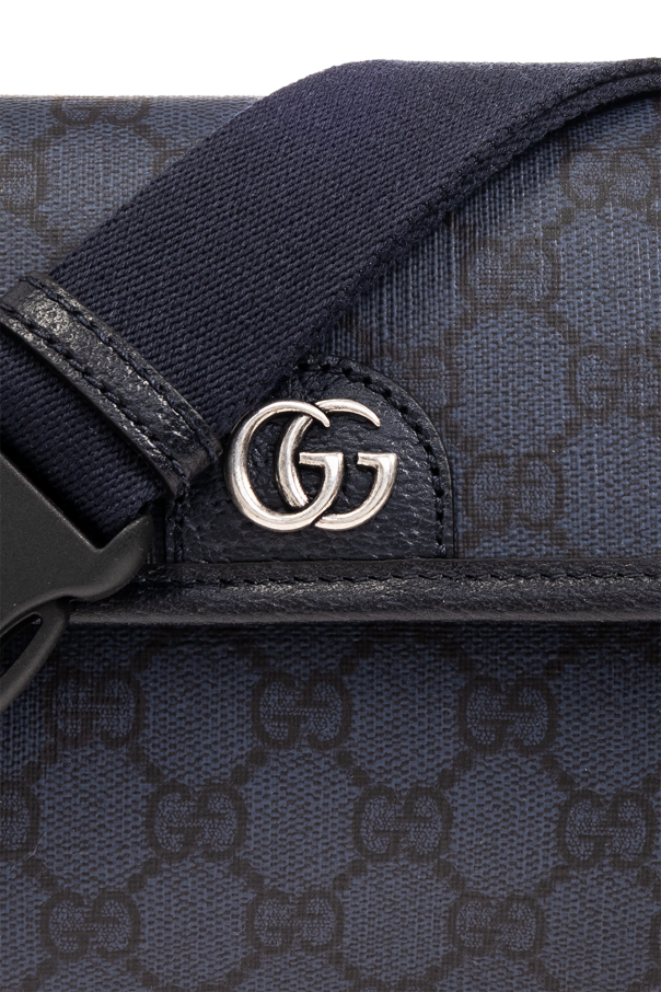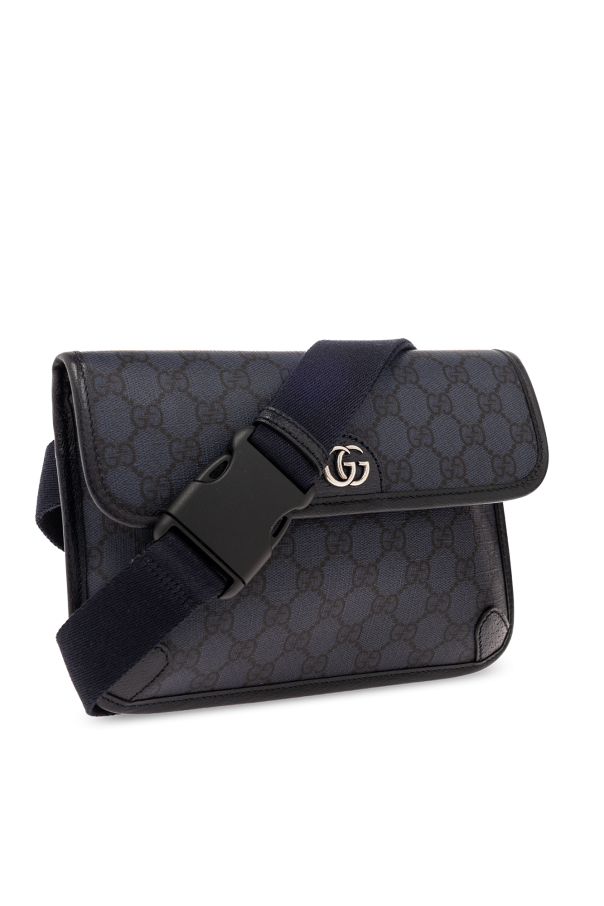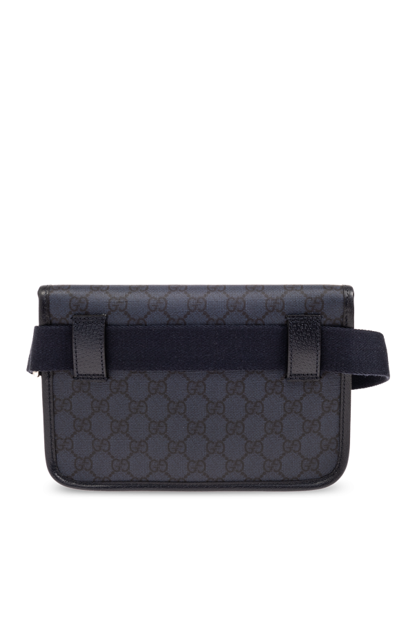 Navy blue and black ‘Ophidia Small’ belt bag from Gucci. Made of the brand's signature ‘GG Supreme’ canvas and trimmed with leather, this design fastens via a magnetic snap and showcases ‘Double G’ hardware on the front. It is complete with an adjustable strap with a buckle, antiqued silver-tone metal elements and one internal compartment.