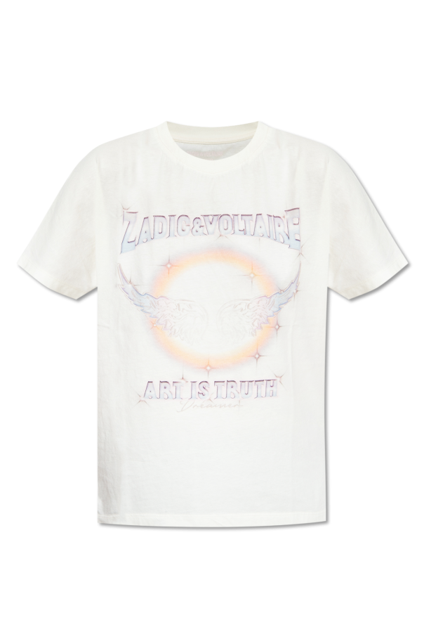 Cream ‘Tommer’ crewneck T-shirt from Zadig & Voltaire. Crafted from organic cotton with the GOTS certificate, this style features a colourful graphic print with the brand's logo and signature wings on the front and back, short sleeves and ribbing on the collar.