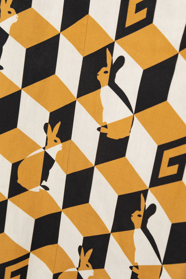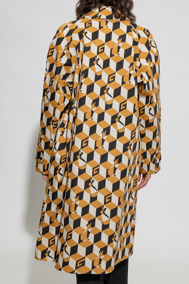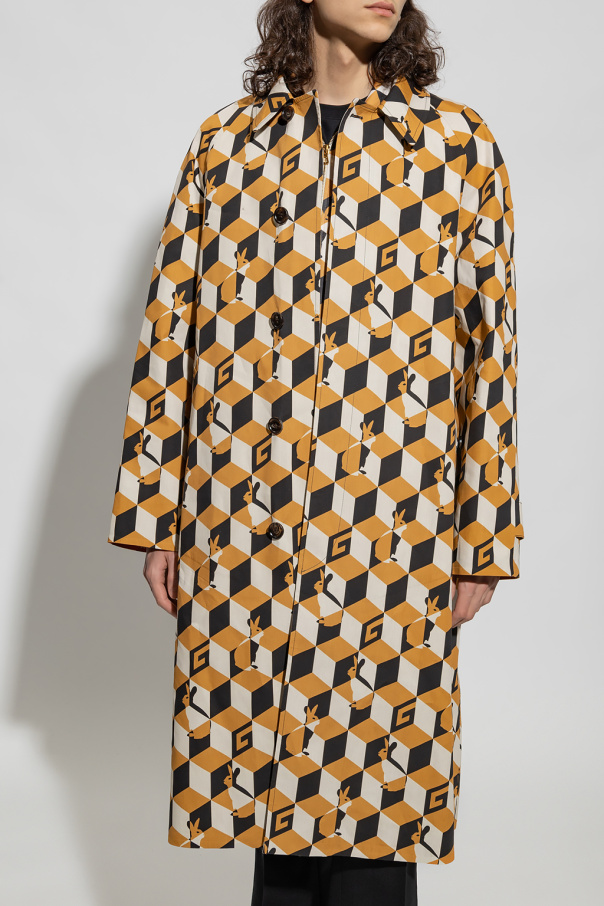 Yellow, black and white coat from Gucci. Made of cotton, this long sleeve design features buttons with a concealed placket, animal pattern, two buttoned pockets and long sleeves.