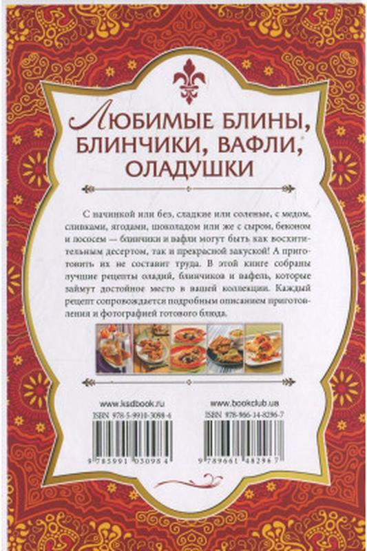 В издании вы найдете проверенные рецепты мучных лакомств с пошаговыми инструкциями их приготовления и яркими иллюстрациями к каждому блюду: черно-белые вафли с малиной, картофельные вафли с беконом, ванильные блинчики с шоколадно-ореховым кремом, блины с сыром, имбирные оладьи с медом, блинчики из гречневой муки. Сделать все это невероятно просто!Издательство: Книжковий Клуб "Клуб Сімейного Дозвілля"