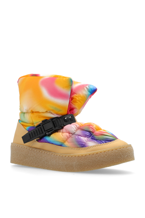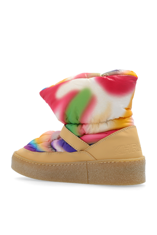 Multicoloured snow boots from Khrisjoy. Made from quilted material featuring a blurred kaleidoscopic pattern, this model sits on a beige rubber sole and employs an adjustable strap with a snap buckle and an embossed logo on the back.