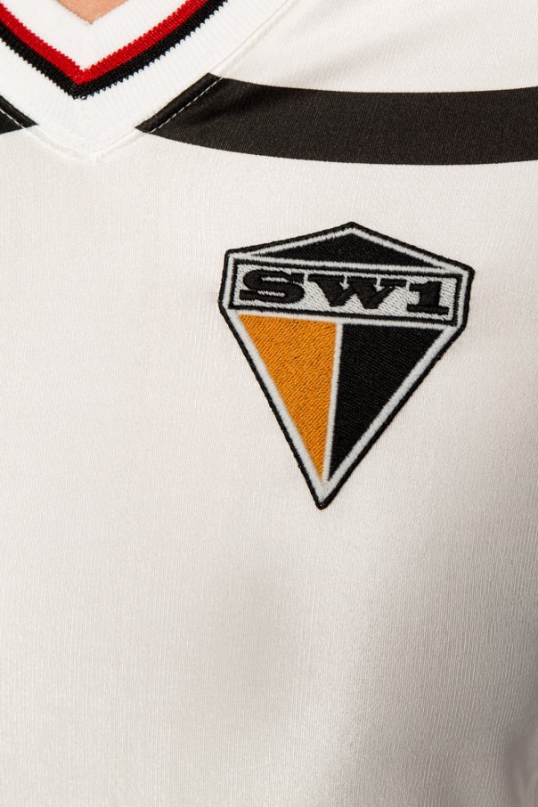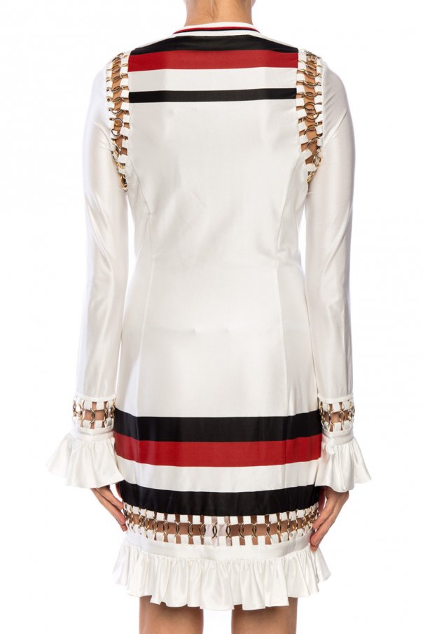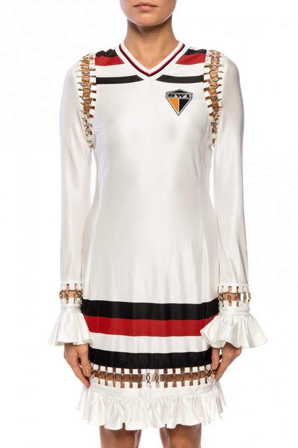 Cream dress with long sleeves from Burberry. Enriched by ruffles, gold-tone and silver-tone decorative elements and a print in red and black. Yellow, black and white patch on the front.