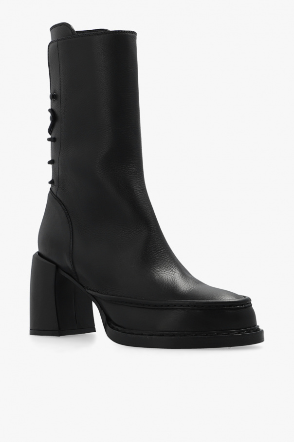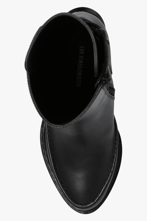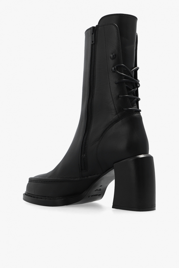 Black ‘Carine’ heeled ankle boots from Ann Demeulemeester. Crafted from leather, this model sits on a black leather sole and features a side zipper and decorative lace-up fastening at the back.