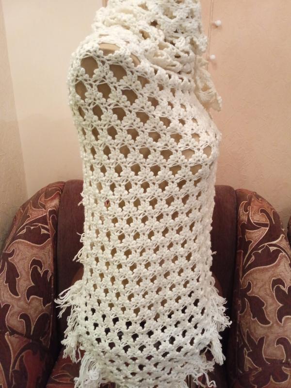 Шаль, хрустящая, связана крючком нитями белого цвета.Размеры изделия:185*130 см.