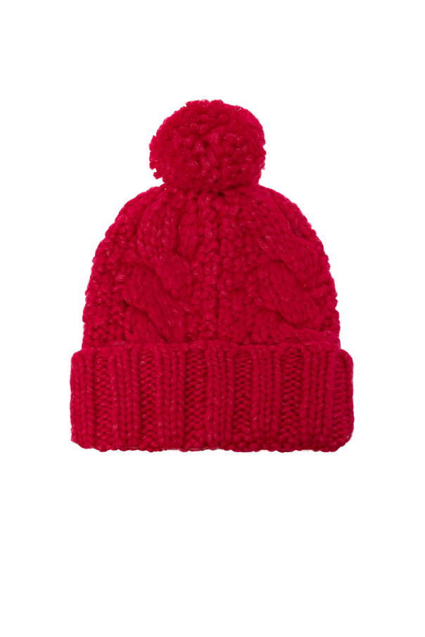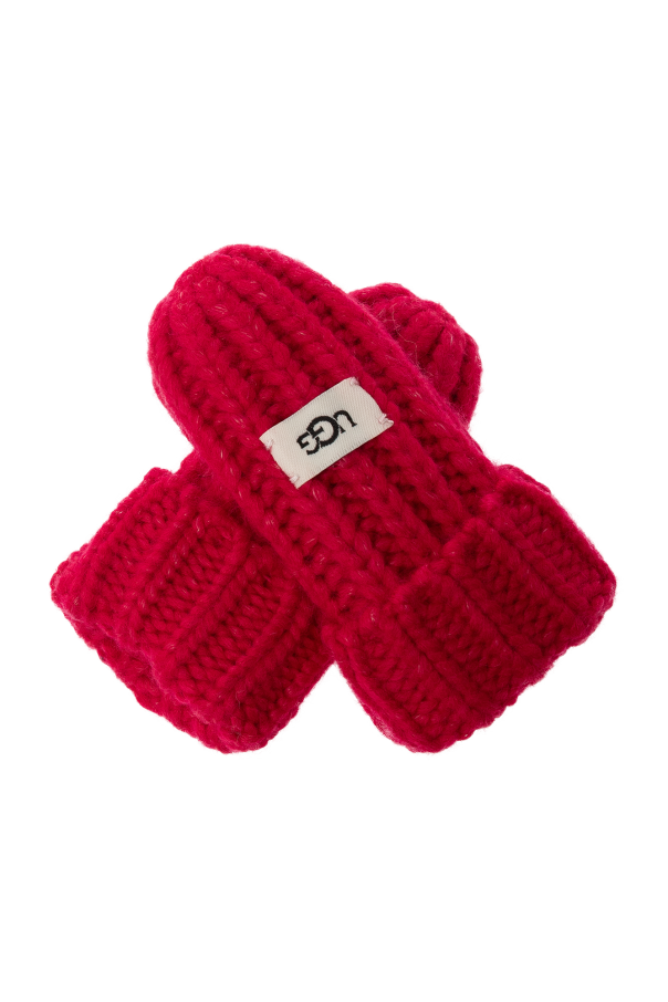 Dark pink pompom beanie & gloves set from UGG. Made from a fabric blend with a chunky knit, it showcases logo patches for brand recognition.